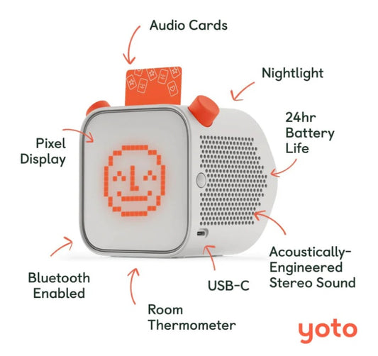 Introducing the popular Yoto player, a screen free and totally kid-friendly way to play music, stories, lessons and podcast with easily controllable knobs. Music and stories are played with physical audio cards*. Yoto Daily, a mirco podcast with new episodes daily on fun facts, jokes and riddles can be played from the speaker easily and is completely free.